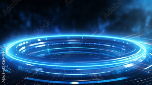 Vibrant blue technology background with abstract digital tech circles - copy space available