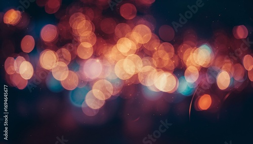 Vibrant blurred bokeh lights glowing within warm orange and cool blue tones, captured against the dark night background, creating an abstract dreamy city atmosphere
