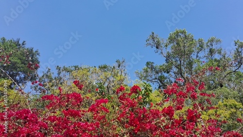 red, flower, sunlight, blue skies, plant, nature, vibrant, green, garden, sunny, bright, summer, beauty, floral, leaf, spring, beautiful, colourful, fresh, bush, bloom, colours, season, day, high-coloured, closeup, growth, natural, close, texture, light, macro, landscape, detail, park, blossom, shrub, background, botany, flora, environment, scene, wild