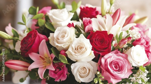 flower, rose, lily, bouquet, floral, arrangement, beautiful, spring, romantic, gift, closeup, colourful, elegant, vibrant, pretty, blossom, decoration, flower petals, red, white, pink, lovely, decorative, fresh, garden, nature, blooming, wedding, present, celebration, love, happy, luxury, special, composition, detail, closeup