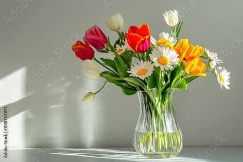 Vibrant bouquet of tulips and daisies in glass vase on sunny morning table Woman's Day celebration concept