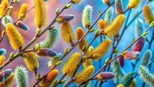 Vibrant catkins unfurl against a contrasting backdrop, delicate forms showcasing intricate textures as spring's awakening unfolds, capturing the essence of renewal and rebirth.