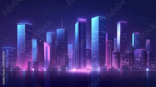 Vibrant city skyline at night with illuminated skyscrapers reflecting on water showcasing modern urban architecture and business vitality