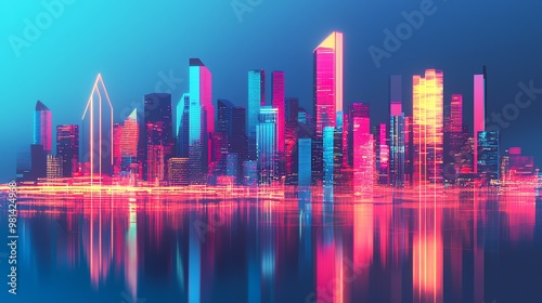 Vibrant city skyline at night with neon lights reflecting on the water, showcasing modern architecture and urban life.