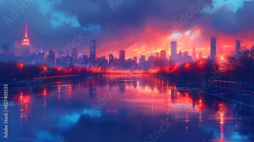 vibrant, city landscape, skyline, red, blue, hue, reflect, calm, water, city, tower, texture, veil, abstract, bright, enchant, urban, glimmer, haunt, eerie, pattern, evening, window, peaceful, river, fog, vision, glare, shroud, darkness, sculpture, graphic, gleam, gloss, door, serene, tranquil, sunset, modern, time, shadow, room, trance, unseen, haze, set, view, landscape