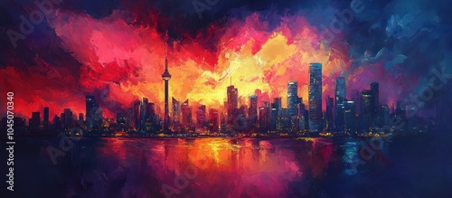 city, skyline, urban, sunset, cloud, water, city landscape, modern, architecture, night, dusk, twilight, building, skyscraper, highrise, downtown, metropolis, bright, high-coloured, colourful, painting, art, digital, graphic, design, illustration, abstract, texture, background, pattern, light, landscape, sky, horizon, nature, beauty, view, panorama, travel, tour tourism, life, dream, future, hope, joy