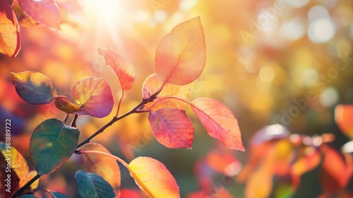 Vibrant close-up of red, orange, and green leaves on a tree, with sunlight illuminating their textures, set against a realistic nature background
