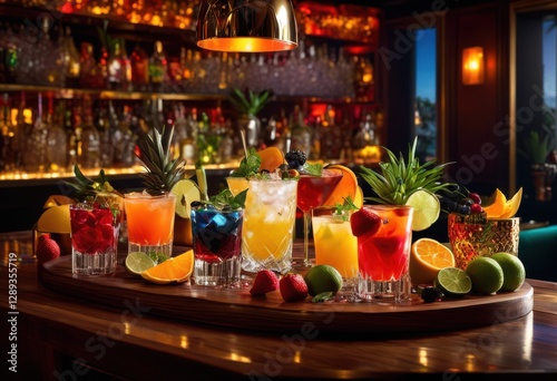 vibrant cocktail ingredients bursting colorful textures fresh fruits herbs liquors garnishes showcase, drink, beverage, syrup, ice, citrus, tropical, berry