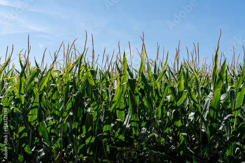 cornfield, green plant, agriculture, agronomy, blue skies, corn, countryside, crop, cultivation, earth, environment, farming, field, growth, harvest, landscape, lush, natural beauty, nature, outdoors, rural, scenery, seasonal, serene, spain, summer, sunlight, vegetation