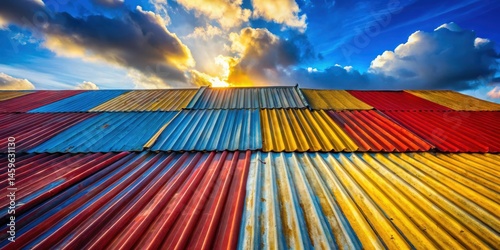Vibrant corrugated metal rooftop under a dramatic sunset sky, showcasing a patchwork of colors and textures, a testament to resilience and unique character