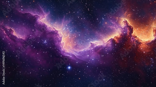 Vibrant cosmic nebula with glowing purple and orange clouds of gas and dust illuminated by distant stars in deep space