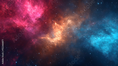vibrant cosmic scene featuring abstract fractal patterns in shades of pink, orange, and blue, resembling nebula filled with stars and interstellar clouds
