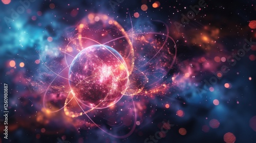 Vibrant Cosmic Sphere Surrounded by Colorful Nebula and Glowing Particle Effects Representing Advanced Technology Concepts
