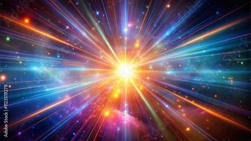 Vibrant cosmic starburst with colorful light beams, celestial wonder