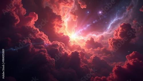 Vibrant cosmic storm with nebula clouds reds purples quasar light stars galaxies