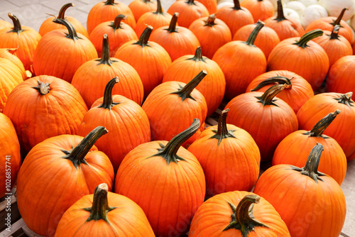 Vibrant display of pumpkins embodies the spirit of Halloween and autumn festivities. The rich, orange hues of the pumpkins contrast with their dark green stems, creating a visually striking image