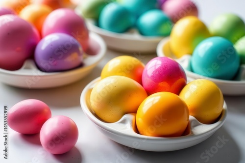 Vibrant dyed eggs, various colors, arranged on white plates, plates, celebration, arrangement