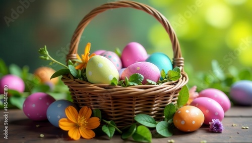 Vibrant Easter eggs fill woven basket, nestled amongst spring blooms on rustic table , food, home, Easter eggs