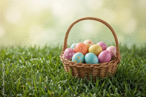 Vibrant Easter eggs nestled in a woven basket on fresh green grass. Space available for text.