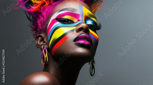 Vibrant face paint on african woman with colorful hair and earrings