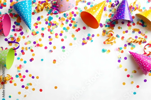 celebration, concept, confetti, colourful, party, hat, decoration, white, background, event, invitation, festive, marketing, fun, joy, holiday, festival, birthday, gathering, cheer, bright, vibrant, ornament, accessory, festivity, carnival, decor, joyful, seasonal