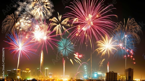 fireworks, celebration, colourful, city landscape, night, skyline, light, event, explosion, festive, glowing, illumination, urban, spectacular, vibrant, pyrotechnic, dazzling, night view, festival, atmosphere, nightscape, radiant, neon, scenic, metropolis, entertainment, architecture, modern, stunning, breathtaking, display, evening, crowded, tower, performance, sparkling, energetic, joyful, dramatic