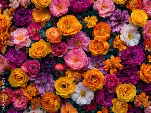 flower, bloom, arrangement, colourful, floral, garden, rose, ranunculus, pretty, decorative, vibrant, pink, orange, yellow, purple, red, bouquet, pattern, texture, nature, beauty, spring, summer, decoration, design, closeup, patterned, background, high-coloured, artistic, fresh, bright, display