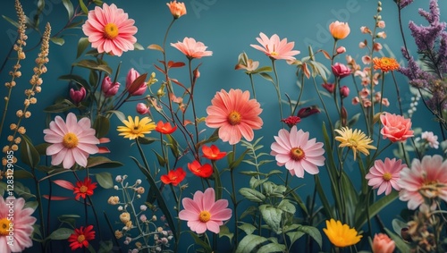 Vibrant floral arrangement featuring diverse blooms against a teal backdrop perfect for nature-themed backgrounds or creative projects.