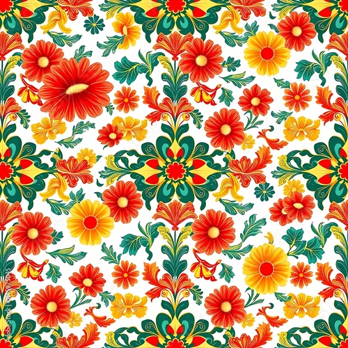 Vibrant Floral Fiesta: A captivating seamless pattern bursts with the rich hues of red, orange, and yellow flowers, intricately interwoven with teal foliage, creating a lively and festive design.