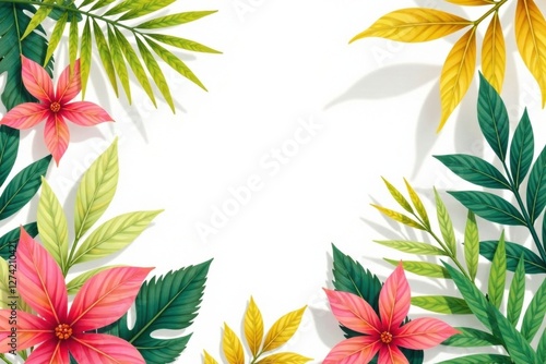 Vibrant Floral Frame Featuring Tropical Foliage and Bright Blossoms, Ideal for Decorative Purposes