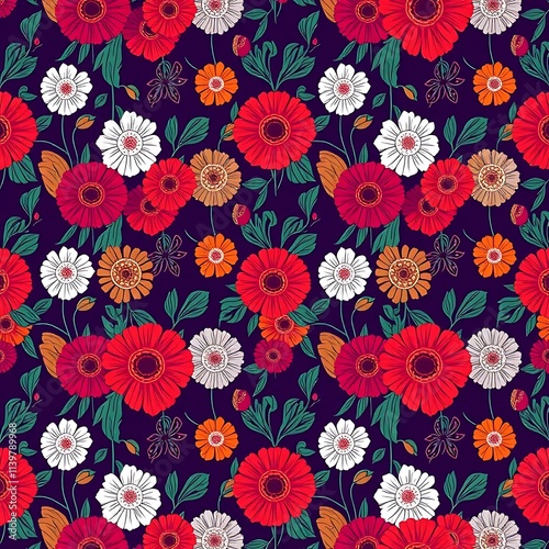 floral, pattern, flower, gerbera, red, white, orange, green, indigo, background, botanical, nature, print, seamless, repeat, texture, design, fabric, wallpaper, textile, digital, illustration, art, abstract, vintage, retro, graphic, whimsical, delicate, romantic, feminine, elegant, spring, summer, joyful, vibrant, colourful, bright, cheerful, happy, bohemian, modern, contemporary