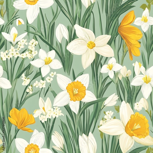 Vibrant Floral Pattern with Daffodils and Spring Flowers Design