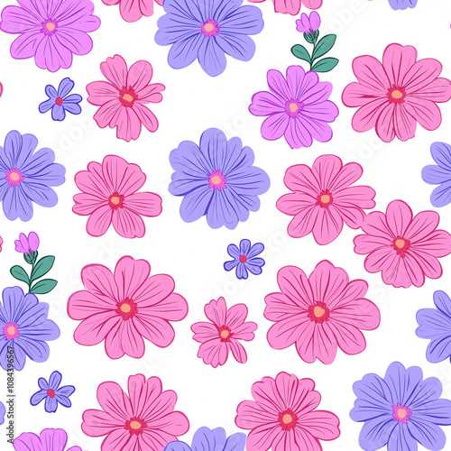 Vibrant Floral Pattern with Various Pink, Purple, and Blue Flowers on a White Background for Nature-Inspired Design Projects