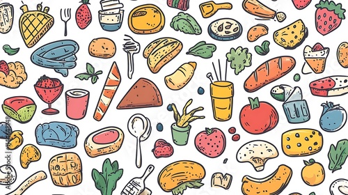 Vibrant food doodles spread across patterned vector art illustration.. AI Generated