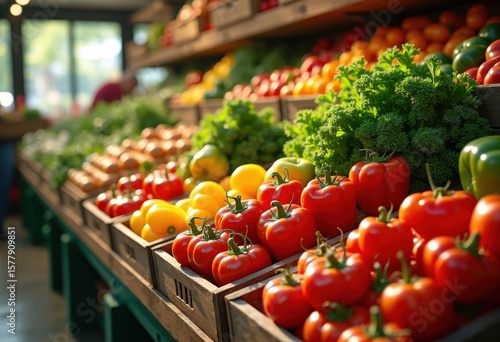 vibrant fresh produce display natural light rustic wooden crates organic vegetables, fruit, harvest, nature, market, colorful, artisan, farmers