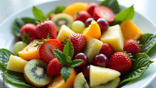 Vibrant fruit salad featuring an assortment of strawberries, kiwi, grapes, orange, and pineapple, perfect for illustrating healthy eating or breakfast ideas, close up