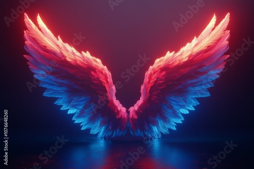 Vibrant glowing wings illuminated in blue and pink hues against a dark background