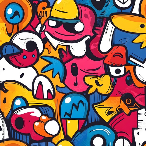 Vibrant graffiti style seamless pattern featu cartoon monsters and abstract shapes ideal for wallpaper backgrounds or textile prints showcasing a playful and energetic design