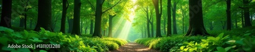 Vibrant green canopy, sunlight dappled forest floor, high angle, ecosystem