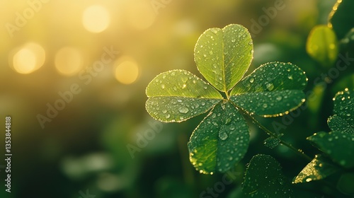 Vibrant green clover with dew drops bathed in golden sunlight, symbolizing luck and renewal in nature's embrace.