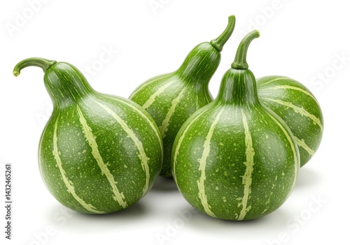 Vibrant green gourds with light stripes a delightful autumn harvest display against a pure white background Crisp detail studio lighting
