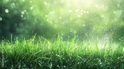 Vibrant Green Grass with Water Droplets Sparkle in Bright Sunlight Refreshing