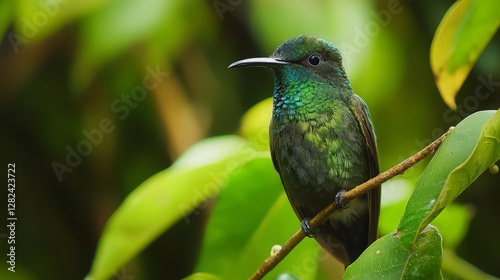 Vibrant Green Hummingbird Perched on Branch in Lush Rainforest