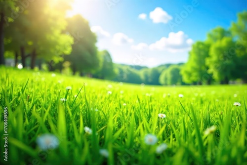 Vibrant green meadow bathed in bright sunlight, perfect for nature-themed projects Lush grass, clear sky, idyllic summer scene, peaceful landscape , day, serenity