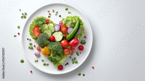 vegetable salad, healthy eating, healthy heart, heart shape, produce, vegan, vegetarian, raw food, detox, diet, nourishment, wellness, white plate, lettuce, broccoli, tomatoes, cherry tomato, cucumber, red onion, bell pepper, radish, herb, parsley, white background, grey background, copy space, overhead, topview, vibrant, colourful, natural, organic, farm fresh, culinary