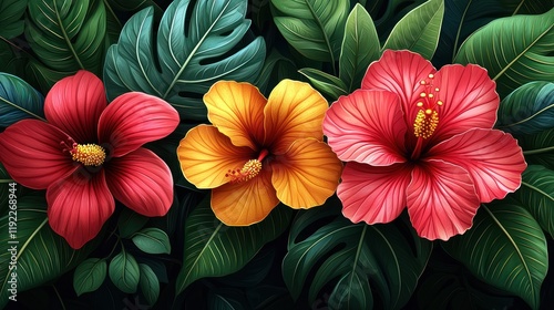 Vibrant hibiscus flowers among lush green leaves.