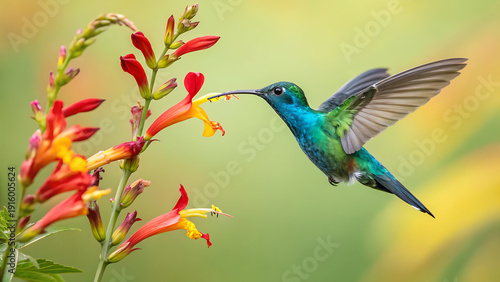 Vibrant Hummingbird Feeding on Red Flowers in Golden Sunlight Nature Scene