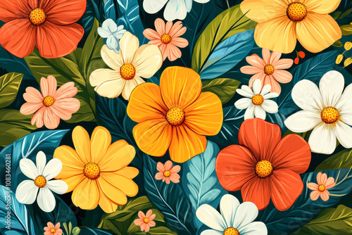 Vibrant illustration of colorful flowers with lush green leaves, perfect for use in spring, gardening, or nature-themed designs and backgrounds,
