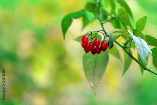 vibrant image showcasing ripe red nightshade berries against a lush green backdrop. The contrast highlights the berries' vivid color and evokes a sense of nature's hidden beauty