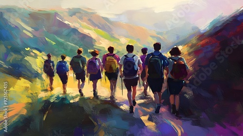 hiking, outdoors, nature, adventure, mountain, trail, friends, group, camaraderie, joy, vibrant, impressionistic, colourful, landscape, scenery, beauty, atmosphere, movement, journey, spirit, togetherness, trek, ramble